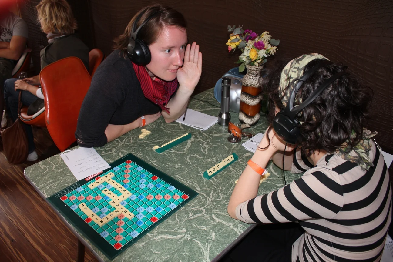 Talk is small: a play with Scrabble is inspired by the work of Rotozaza (UK). Strangers are given instructions for words to speak and actions to carry out. There are no performers, no audience members – just the participants, performing the work for themselves.